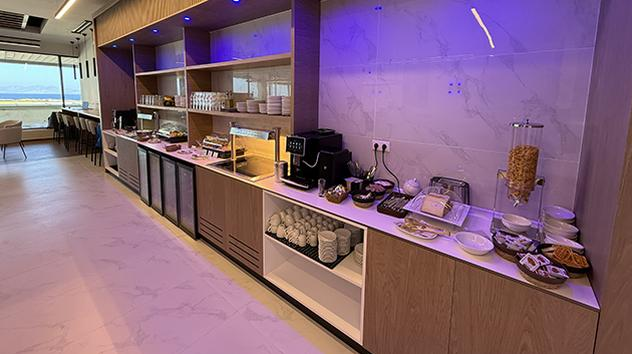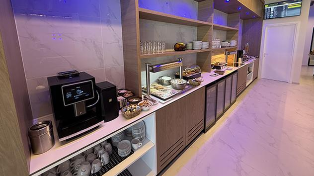 La Sala Rhodes está diseñada para que los pasajeros disfruten de un momento agradable antes de sus vuelos. El salón cuenta con bar, sala zen para relajarse, zona de juegos infantiles y wifi. Ofrece una magnífica vista de las aguas del Egeo.